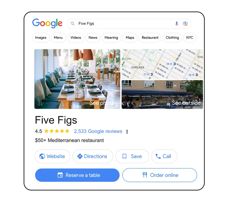 Keep your restaurant growing and fill seats with steady access to new customers from billions of searches on Google. Be more discoverable across Google Search, Reservations and Maps.
