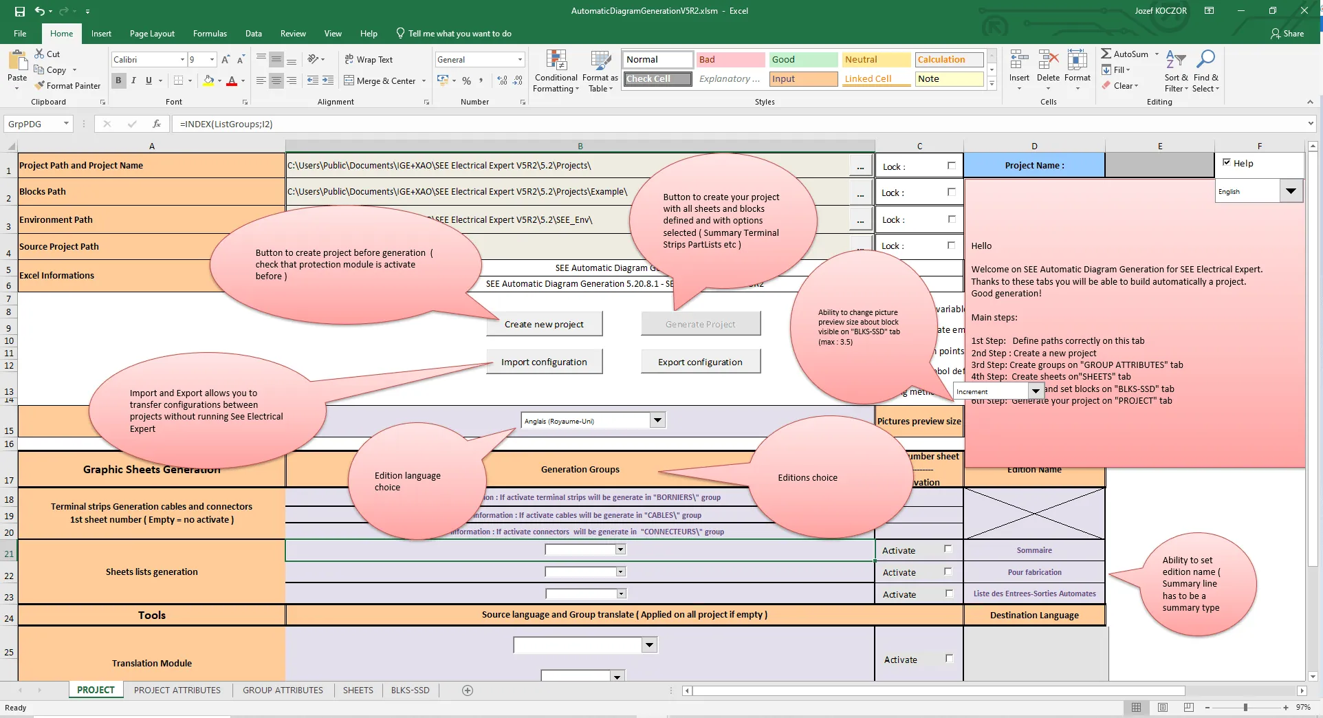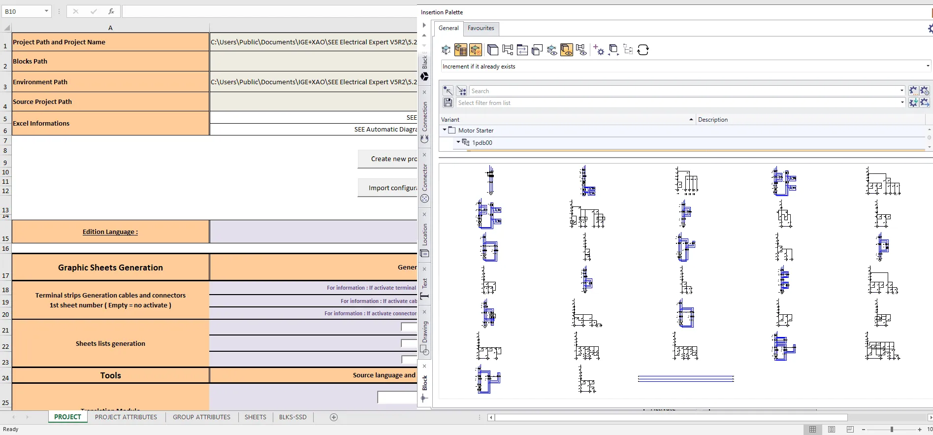 - The entire structure of an electrical project or product can be managed using Excel. The user can declare which electrical block or macro to use and in which diagram. The location of the blocks and all electrical parameters of the associated symbols should also be provided in the Excel spreadsheet. Users choose blocks from the block library existing in the SEE environment.