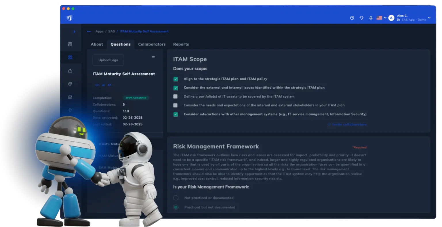 Self Assessment Service (SAS) is a business process evaluation tool developed by Licenseware to help organizations assess and improve their IT Asset Management (ITAM) maturity. It combines best-in-class ITAM process experience with AI-driven report generation to deliver precise, actionable insights aligned with ISO19770-1 standards.