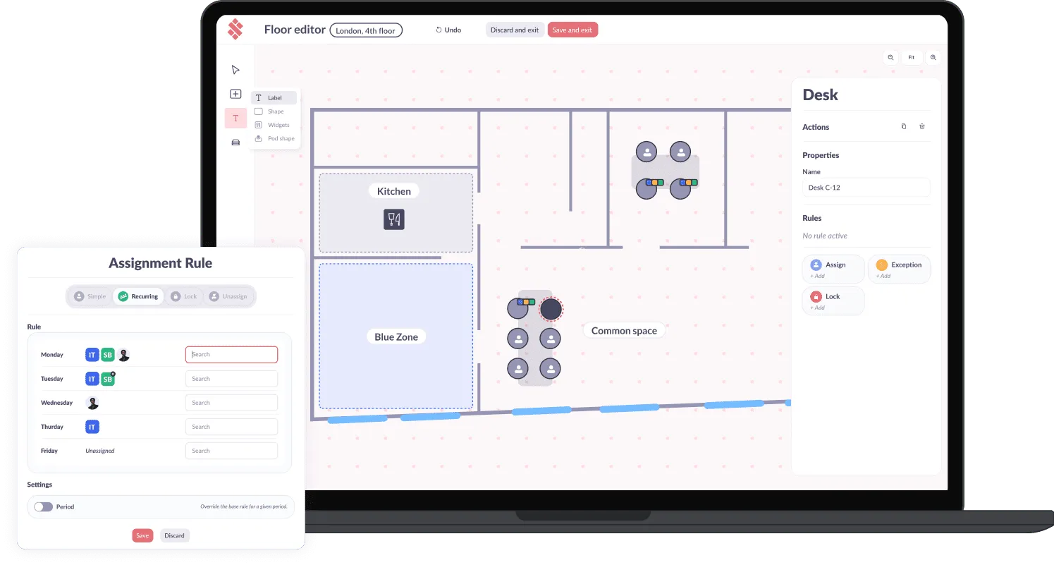 - Workspace Management: Design and manage floor plans, assign desks and zones, and apply advanced rules for space allocation.