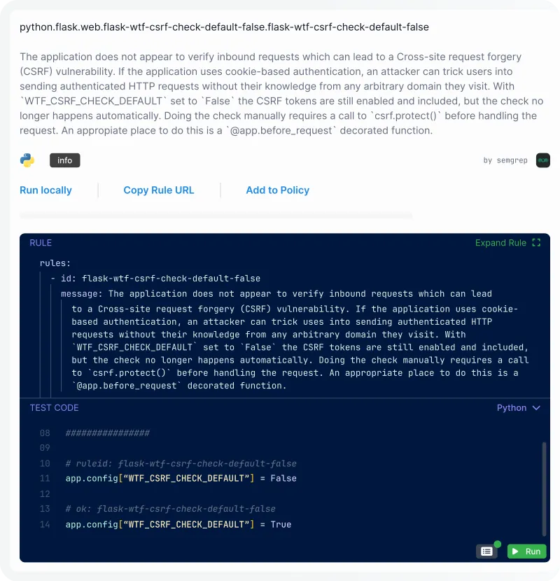 Semgrep Code is a Static Application Security Testing (SAST) solution designed to empower developers to quickly identify and fix security vulnerabilities directly within their workflow.