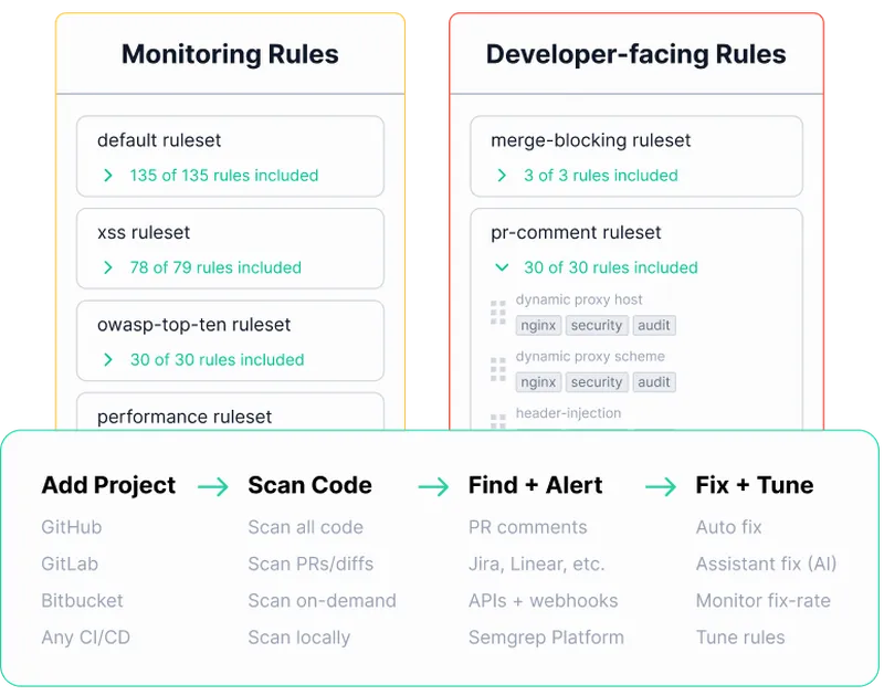 - Focuses on high fix rates by providing actionable, high-confidence rules that developers can easily understand and remediate.