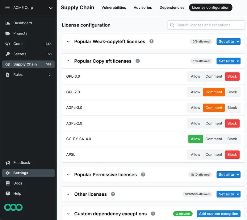 - Provides full visibility into license composition, allows configuration of policies to block non-compliant licenses, and enables on-demand searching of the codebase for any dependency at any version.