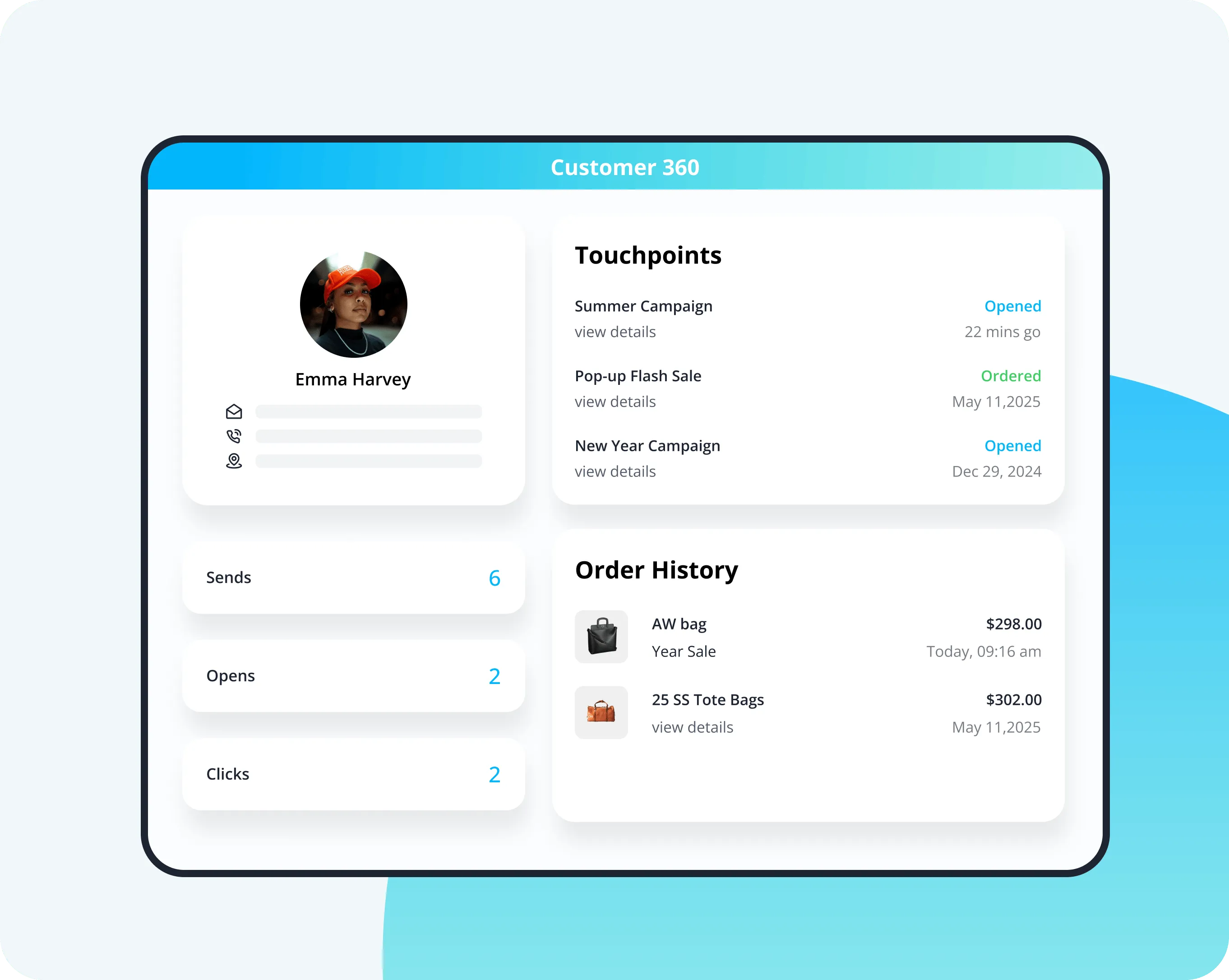 - **Unified Customer Profiles: **Integrates marketing, sales, and support data to provide a 360-degree view of each customer, allowing agents to understand purchase history, preferences, and prior interactions.