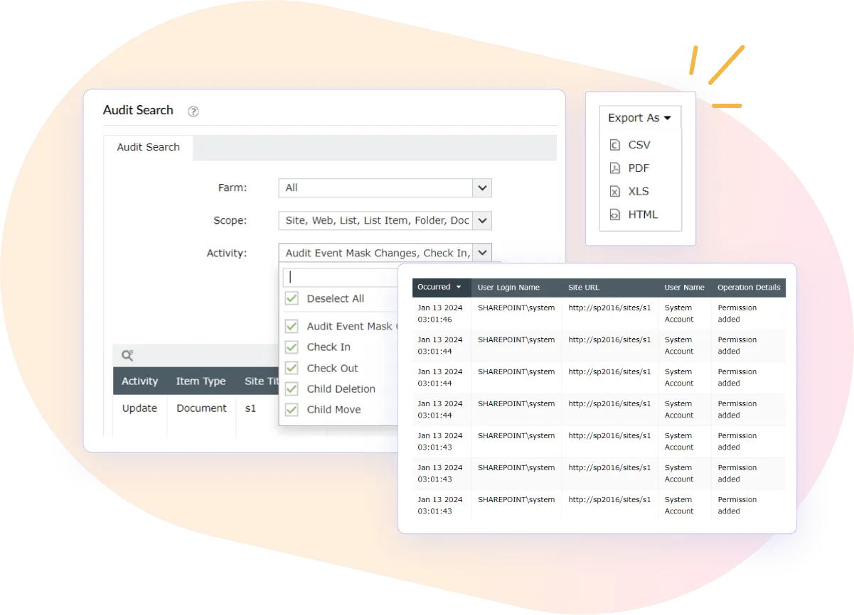 Comprehensive Reporting Generates exhaustive reports on site activity, permissions, user/group access, and component-level changes.