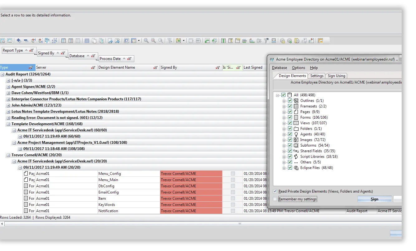 Work with design element signatures with unmatched scope, speed, and security. Audit and sign design elements across any number of databases and servers with full ID flexibility. Signatures will never be a burden.