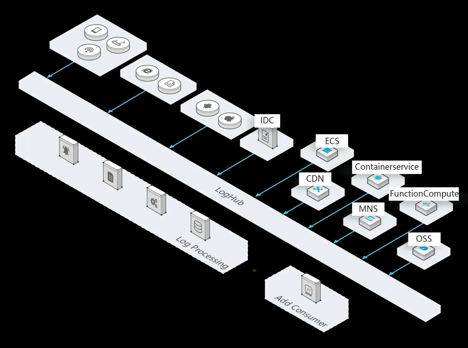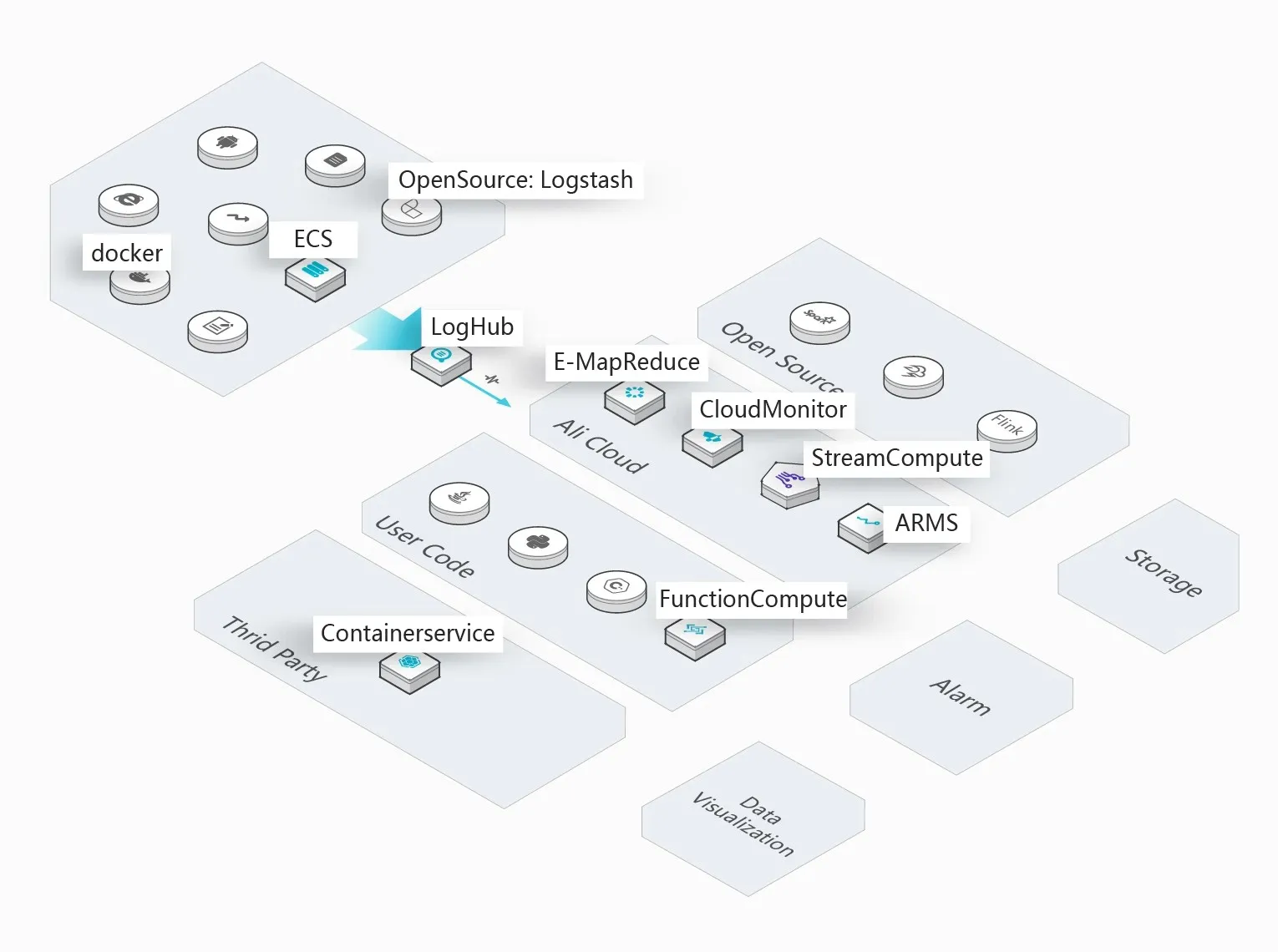 Integrated with Alibaba Cloud software, open-source software, and commercial software. LogHub LogHub supports more than 30 data accumulation tools, such as Logstash and Fluent, for easy integration with embedded devices, webpages, servers, and programs. LogHub integrates with various consumer systems, such as Spark Streaming, Storm, Flink, StreamCompute, CloudMonitor, and ARMS. LogShipper Supports user-defined partitions and multiple data formats, such as TextFile, SequenceFile, and Parquet, and ships data to storage engines, such as Presto, Hive, Spark, Hadoop, E-MapReduce, MaxCompute, and HybridDB. LogSearch/Analytics Supports the complete search and analysis syntax that is compatible with SQL-92, and supports connections using Restful APIs and Java Database Connectivity (JDBC), and visual analysis tools, such as Grafana, DataV, Zipkin, and Jaeger.