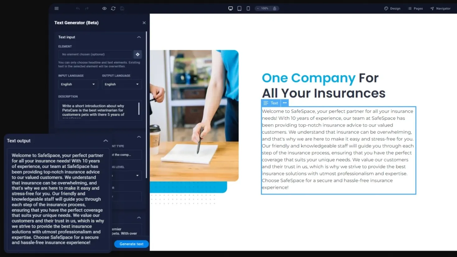 - AI Text Generator: Automatically generate website copy and embed it directly into pages.