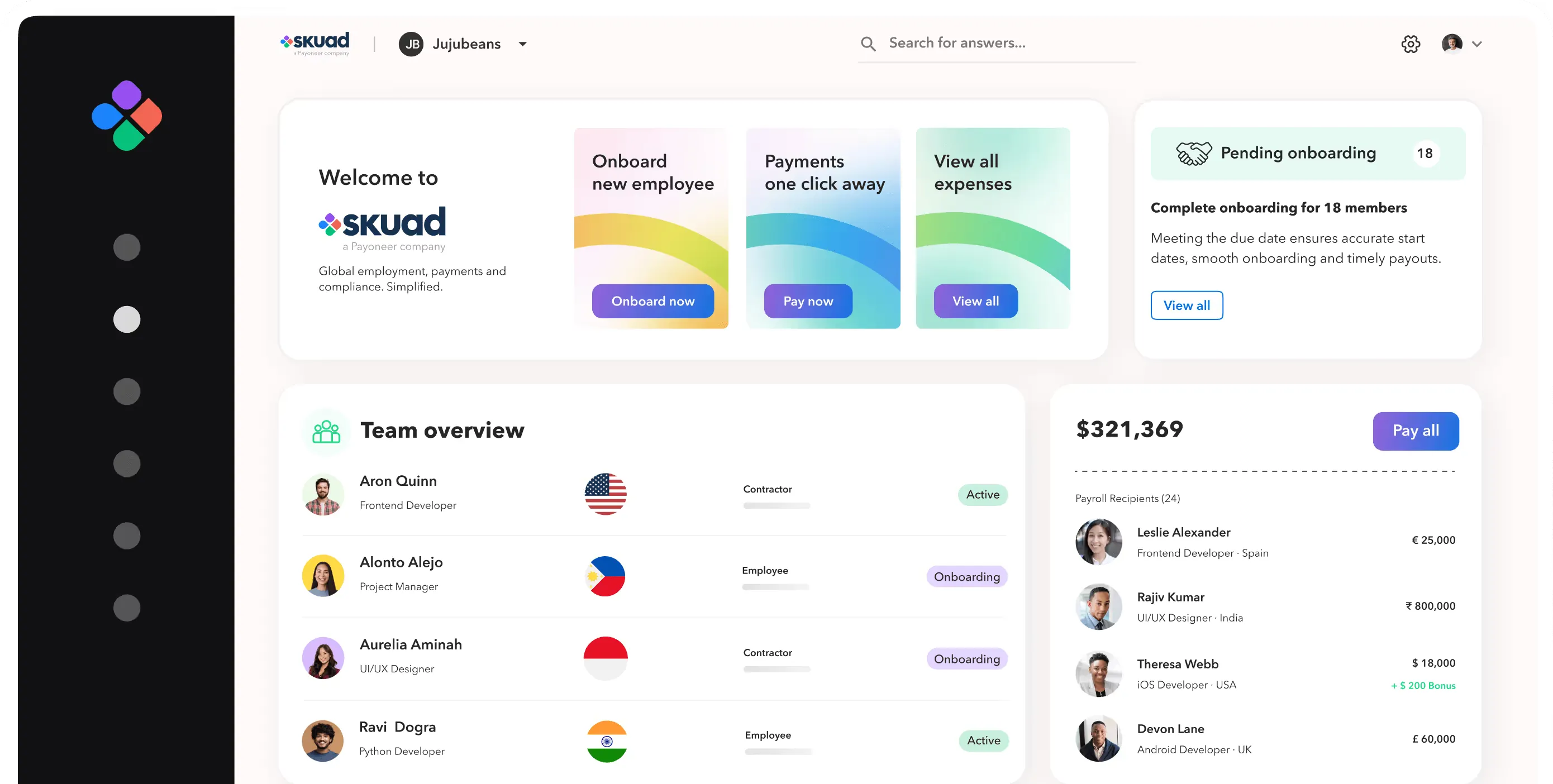 Skuad, now Payoneer Workforce Management (WFM), is a comprehensive global HR platform designed to simplify international employment for businesses. It enables companies to hire and pay employees and contractors in over 160 countries without needing a local entity. The platform facilitates instant onboarding, secure global payroll processing with a single click, and ensures 100% compliance with local employment laws. Key functionalities include managing benefits, work permits, and timesheets. Skuad is trusted by global leaders across various industries, offering unmatched customer support with dedicated experts and round-the-clock assistance. It provides seamless operations for global employment needs, from hiring specific roles like product managers in Mexico or SEO specialists in India, to managing international talent. The platform supports digital onboarding, compliant contract generation, document collection, and work device issuance. It streamlines payments in 70 currencies, ensuring timely and compliant disbursement to employees and contractors, while also handling taxes, deductions, and payslips. Skuad prioritizes compliance with local laws, country-specific taxes, and audit readiness to mitigate legal risks. It also offers country-specific benefits packages to keep teams healthy and motivated. The platform's talent experts can help find the perfect match for global teams, ensuring skill, diversity, and fit. Skuad offers transparency in its fee structure, extensive country coverage, and dedicated support, making it a valuable partner for global expansion.