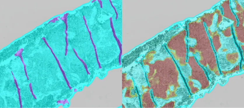 Artifacts can prevent image analysis and AI algorithms from yielding correct results. SlideQC BF automatically detects and annotates artifacts present on slides, preventing them from being analyzed by algorithms, which increases the accuracy and quality of the analysis results while maximizing the utility of tissue.