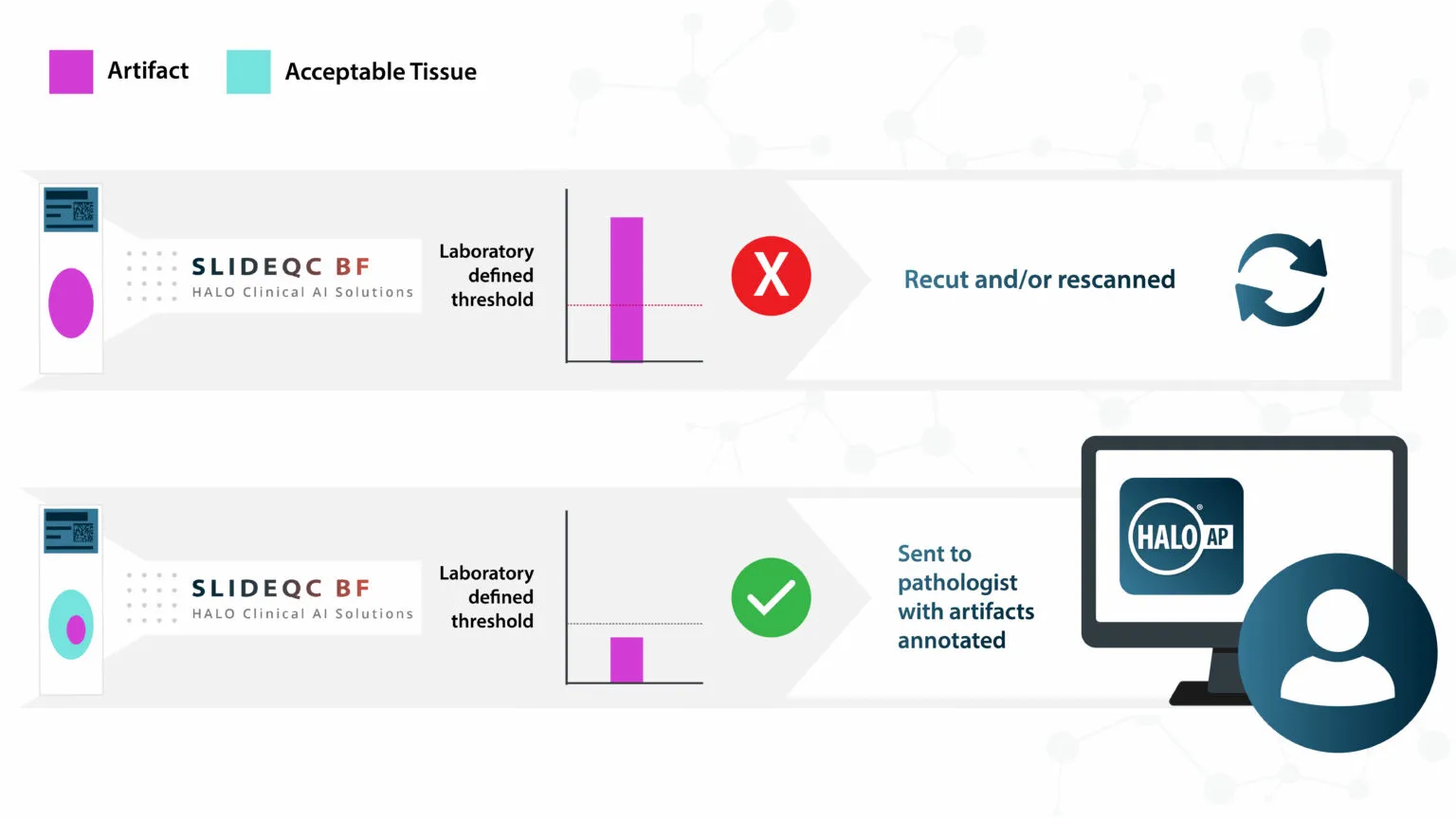 Within HALO AP®, SlideQC BF can automatically tag cases with slides meeting or exceeding a laboratory-defined artifact threshold for recut or rescan. Cases can then be triaged into separate worklists for automated quality control workflows, all before the pathologist ever receives the case.