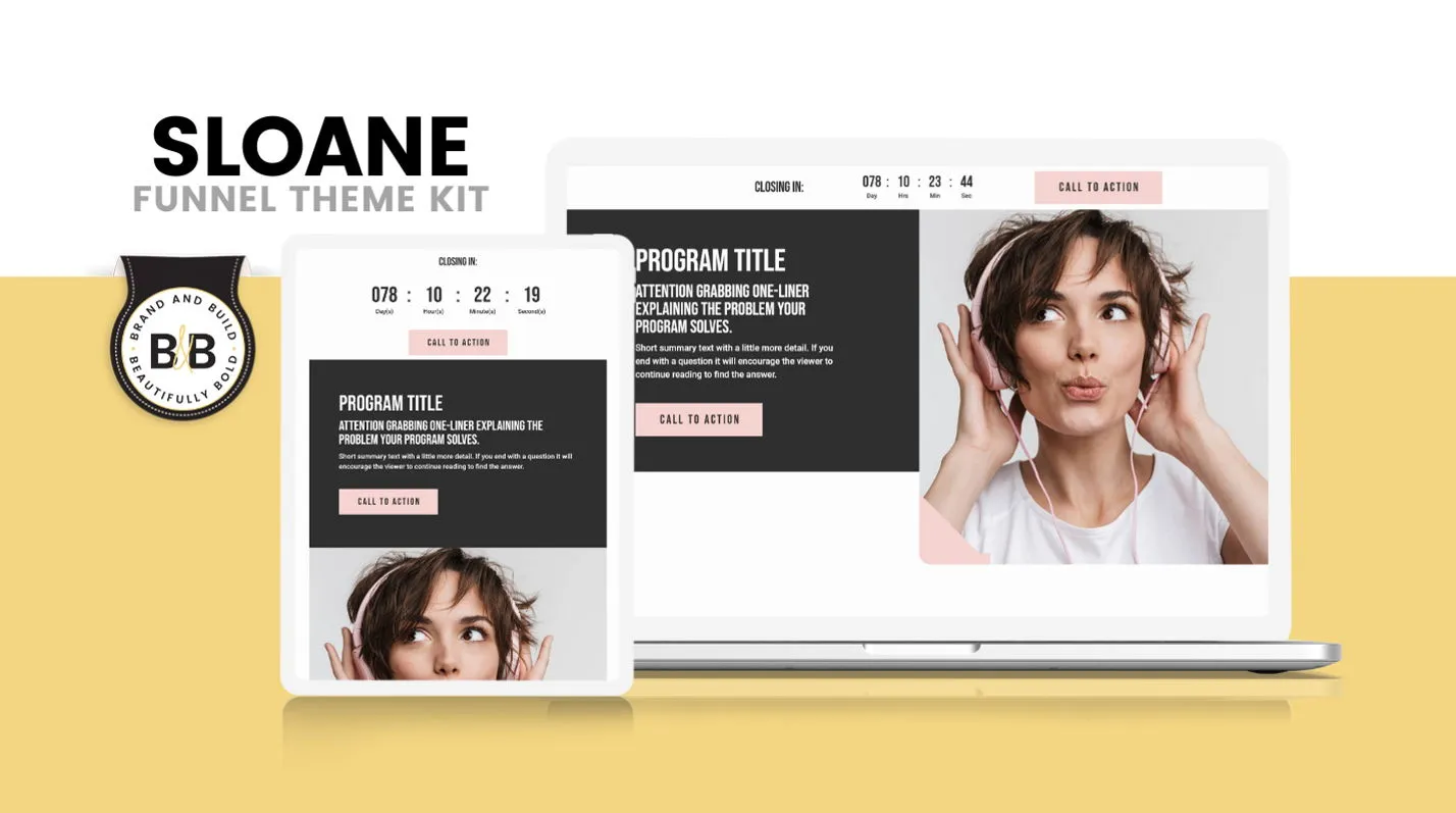 Sloane is a Divi funnel kit ideal for podcasters and coaches. Utilising a bold and bright colour palette that’s easy to customise for your brand, the Sloane funnel kit features 12 library layouts for a complete sales funnel. Included are Canva templates for lesson covers and program device mockups.