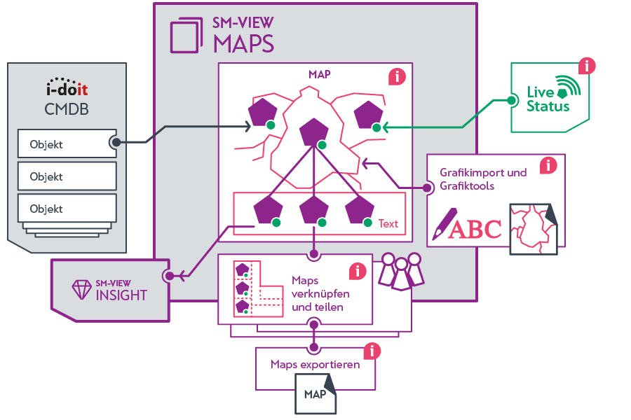 Tired of endless tables in your IT documentation? With SM VIEW MAPS you can create a map of the entire IT infrastructure that everyone can see at a glance. SM VIEW MAPS also allows you to create service dashboards and effectively present your IT.
