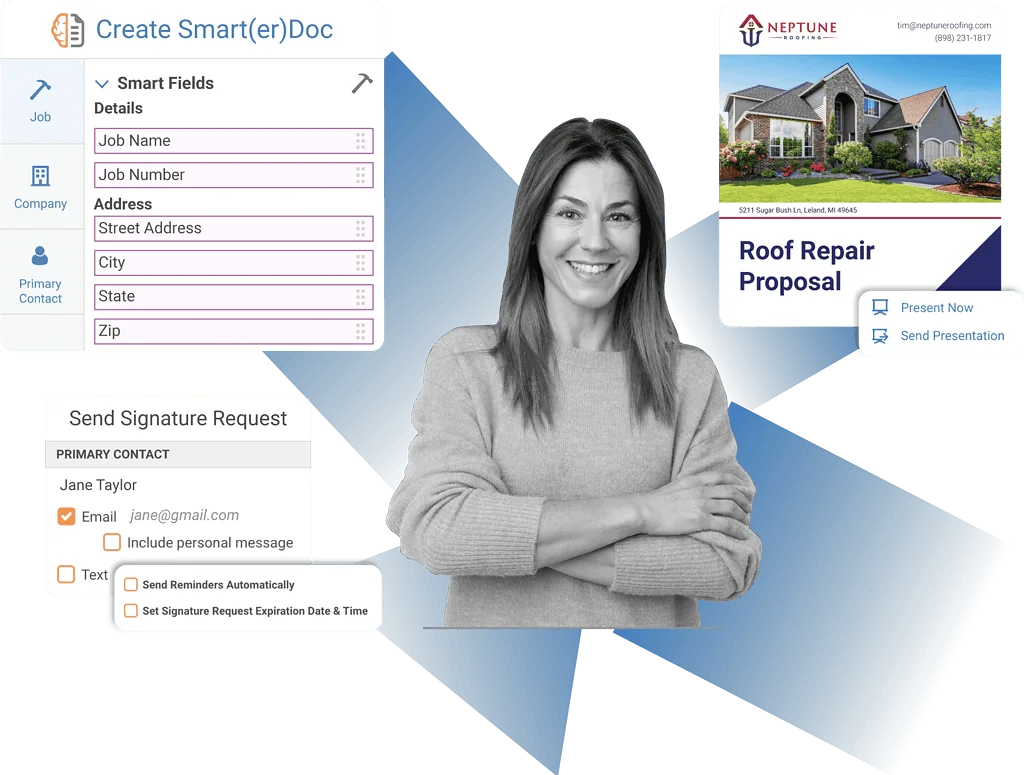 Smart(er) Docs is integrated into AccuLynx, the leading all-in-one roofing software. It streamlines creating, presenting, and signing roofing documents—proposals, contracts, change orders, and more—so teams can close jobs faster. Templates can auto-populate from the job record, and a drag-and-drop editor makes on-the-fly customization easy. Digital signatures with reminder and expiration features speed sign-off, while secure links allow customers to review and sign from any device.