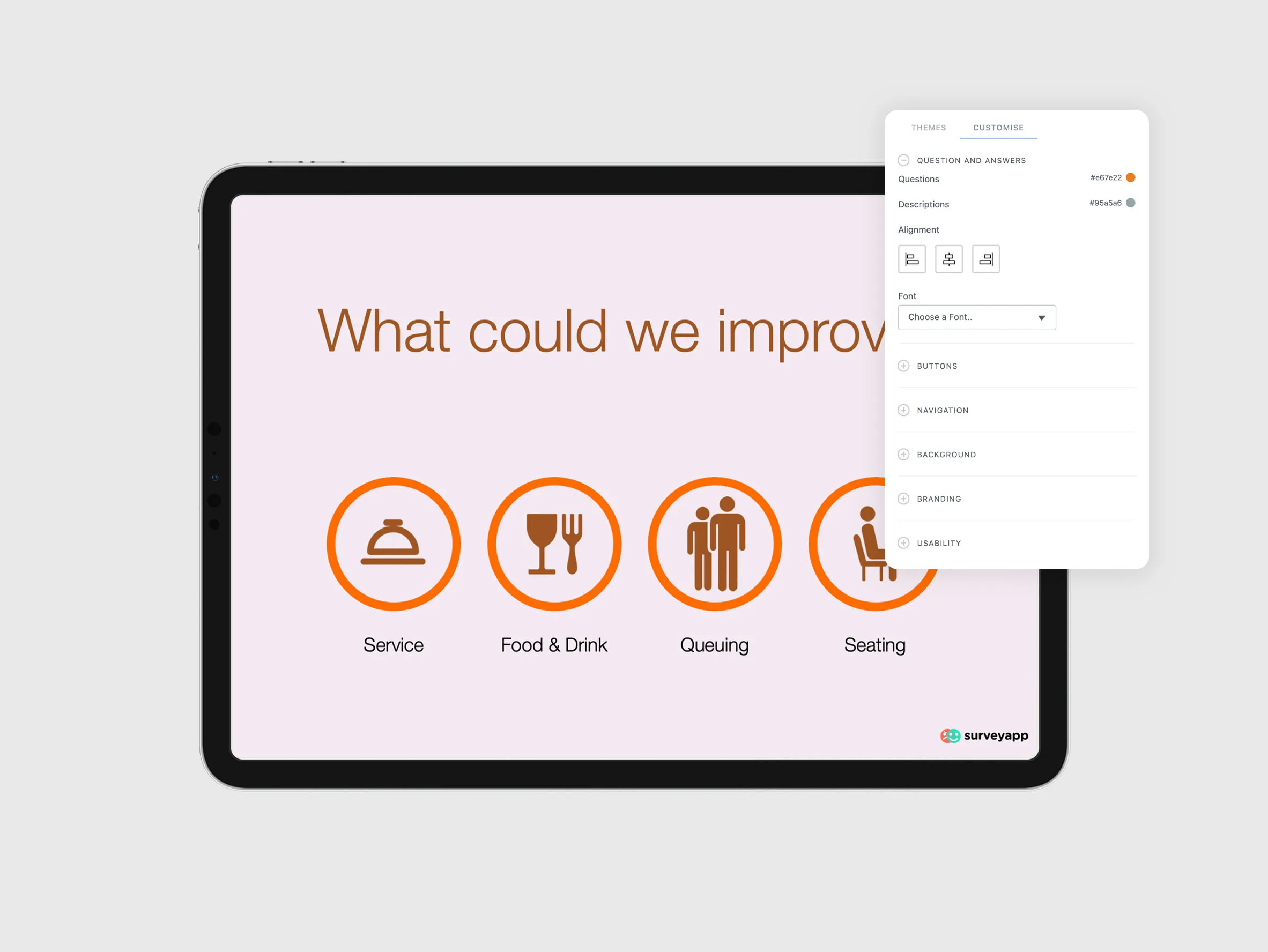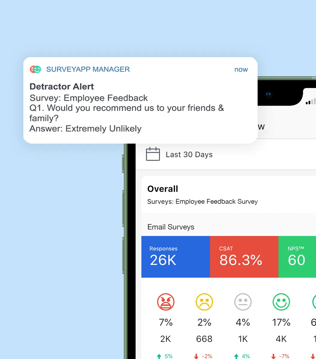 Collect feedback offline with Surveyapp's intuitive survey app for iOS and Android, featuring smiley face options and customizable branding.