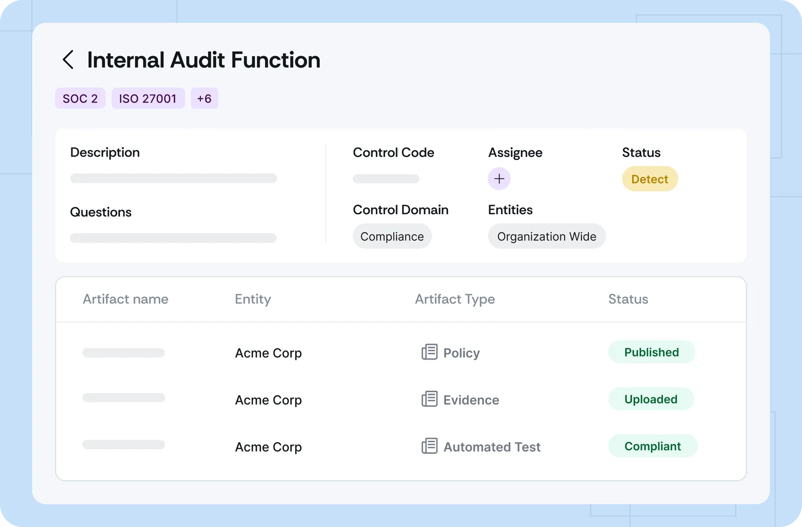 Prebuilt controls for a faster start Get a head start on your SOC 2 journey with prebuilt controls and a content library mapped to SOC 2 Trust Service Criteria. Upload and sync existing security policies, or create new ones using auditor-approved templates built for SOC 2. Assign control owners, map compliance artifacts, and monitor progress via a real-time dashboard so you can stay on track for SOC 2.