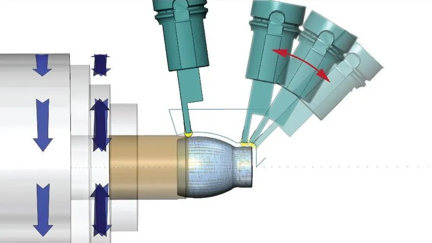 - 4th Axis Simultaneous Turning: performs machining of curved profile, using B-axis tilting capabilities of the tool, in order to machine undercut areas in a single step.