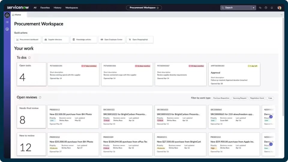 ServiceNow's Sourcing and Procurement Operations is a comprehensive SaaS solution designed to simplify and automate indirect procurement processes. It creates a single engagement layer across systems, orchestrates teams and end-to-end processes efficiently, and leverages AI to eliminate manual work, enhance employee experience, and accelerate business processes.