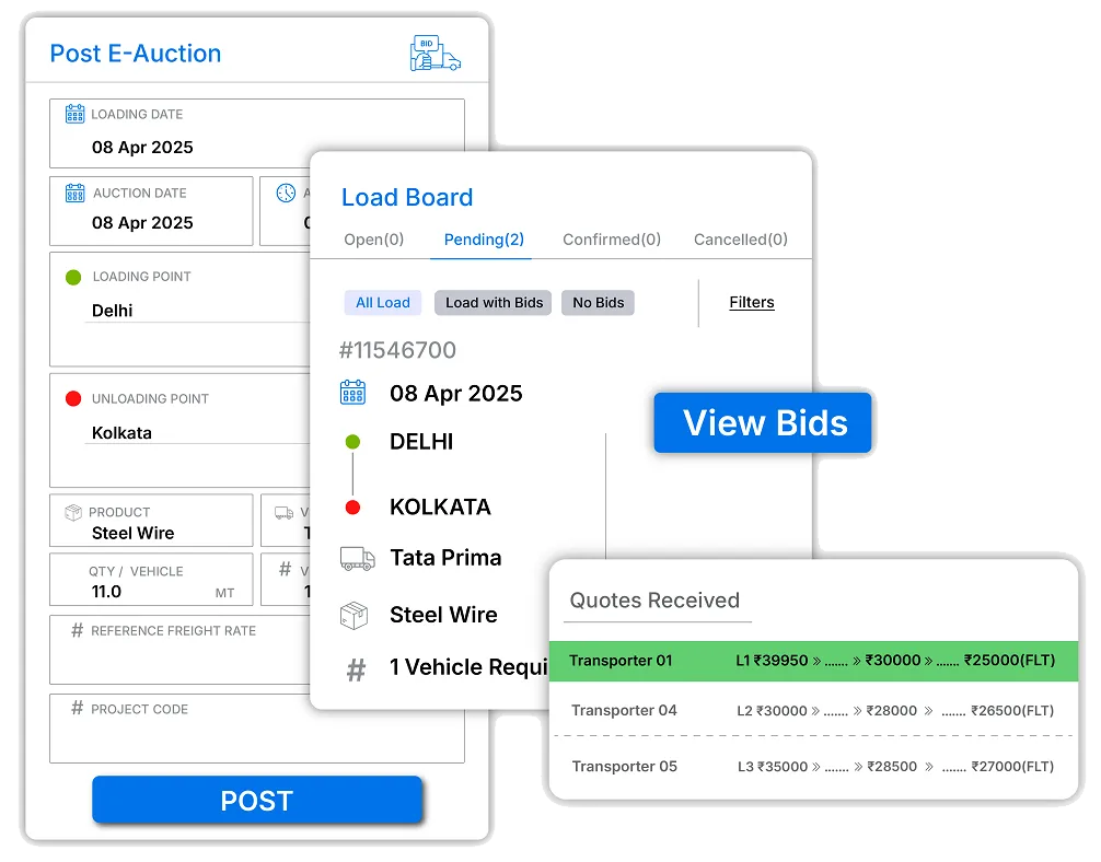 - Real-Time Visibility: Provides live updates on bids, transporter responses, and sourcing status.
