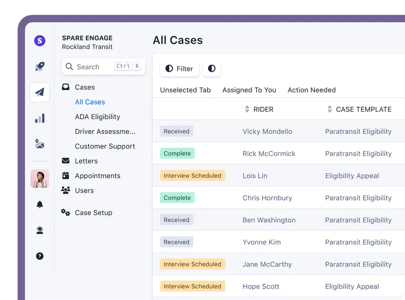 Spare Eligibility is a digital solution designed to streamline the rider eligibility process for paratransit and other specialized transit services. It enables transit agencies to manage applications, assessments, and communications efficiently while ensuring compliance with regulatory standards. The platform supports AI-powered tools and customizable workflows to improve accuracy, transparency, and operational speed.