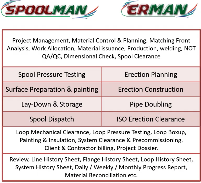 SPOOLMAN-ERMAN is a solution for planning, management of material & construction activities for spool fabrication & erection at shop/site.