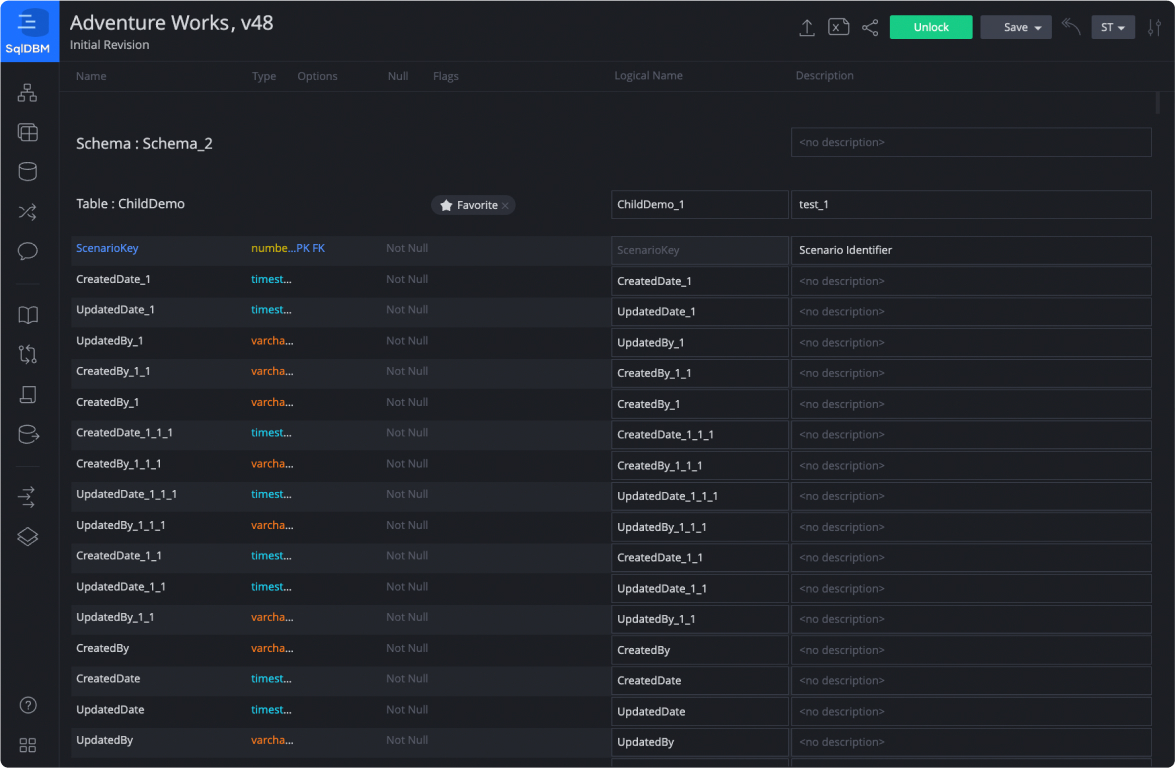 Subject areas Distributed teams can happily share the same database platform and organize themselves across projects using subject areas - keeping their diagrams separate while having global enterprise visibility. Comments and metadata is picked up automatically during the reverse engineering process and can be maintained via Excel by anyone in the organization. Multiple projects and database platforms Zhamak Dehghani first introduced the concept of a data mesh to overcome the ungovernability of data lakes and the bottlenecks of monolithic data warehouses. But distributed data teams can still take advantage of SqlDBM’s one-stop documentation and search across multiple projects and database platforms.