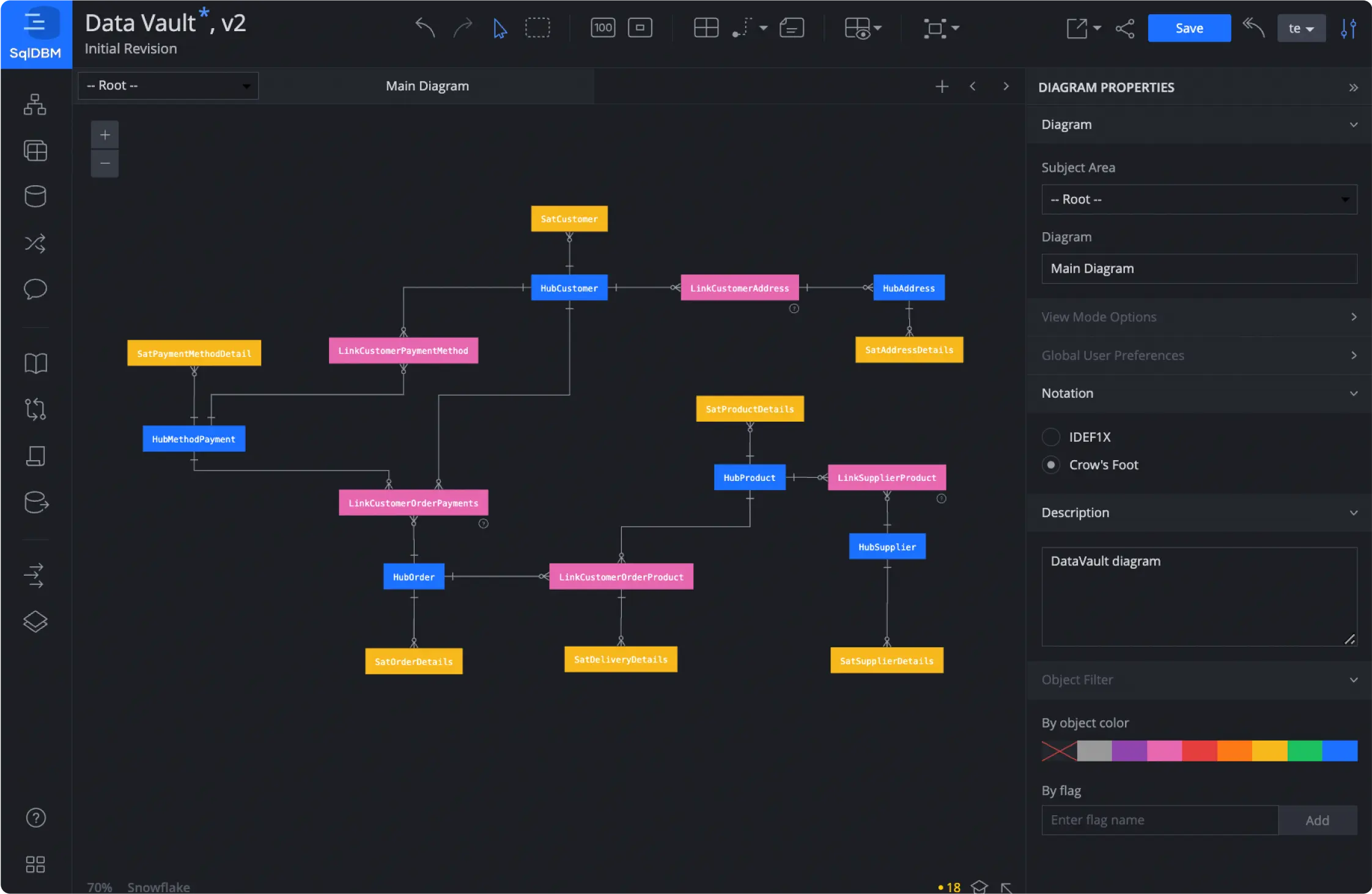 A sponsor of the WWDVC SqlDBM is a strong supporter of the data vault community, a sponsor of the WWDVC conference two years running, and the modeling tool of choice during official data vault courses. Hubs, links, satellites SqlDBM’s templates, naming conventions, and logical to physical translations are built to ensure consistency and time savings in repeatable operations such as the creation of hubs, links, satellites, and bridge tables. Colors and view modes Colors and view mode options make it easy for users to find their way around expansive DV architectures and work with them at any level of detail. Automated DV templates and an object creation wizard are currently in the works and will be available soon, along with other exciting enhancements.