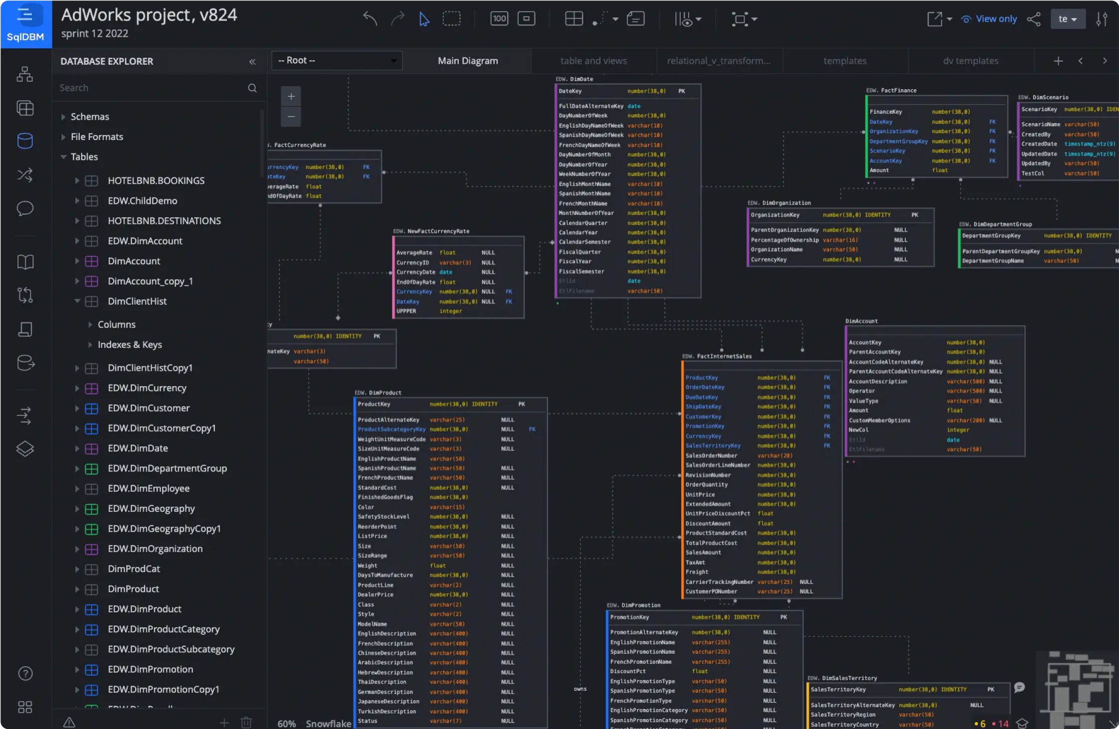 Latest Snowflake features Support for the latest features like Snowflake’s VARIANT datatype for semistructured data, views, and column lineage allows users to go beyond pure relational modeling. Model and present SqlDBM diagrams are living interactive documents that allow users to present their designs in real-time at any level of detail - from conceptual to physical - and generate the DDL, alters and YAML. Views, functions and procedures In our diagrams, objects such as views and procedures can live alongside physical tables to provide insight into data pipelines and transformations at the heart of a data warehouse.