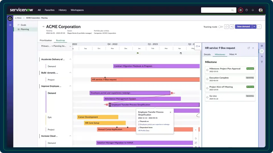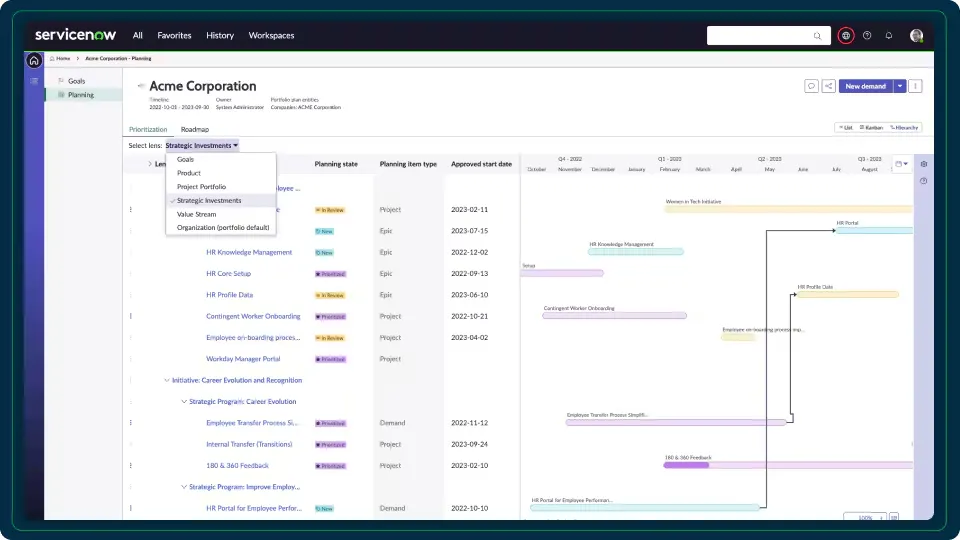 ServiceNow Strategic Planning is a software solution designed to help organizations align their work with strategic goals, prioritize initiatives, and manage hybrid project approaches through visual roadmaps and automated goal tracking.