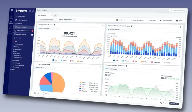 - Instant Insights: Analyse and understand media coverage in real time using 35 customisable charts. Export findings instantly into shareable reports.