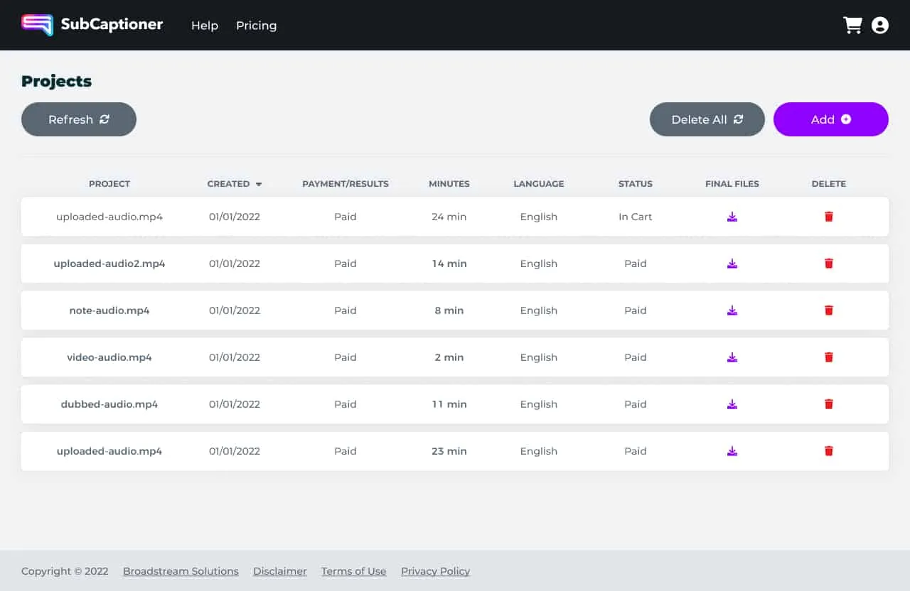 SubCaptioner is a cloud-based automated transcription and captioning service that leverages advanced ASR (Automatic Speech Recognition) technology to generate accurate captions, subtitles, and transcripts for both pre-recorded and live media content. Users simply upload audio or video files, pay per minute, and receive downloadable caption and transcript files in minutes. The platform supports multiple input and output formats, offers translation into over 50 languages, and includes an online editor for quick adjustments. Designed for ease of use, SubCaptioner eliminates the need for manual transcription, making it accessible for creators, businesses, educators, and professionals seeking fast, scalable, and cost-effective captioning solutions
