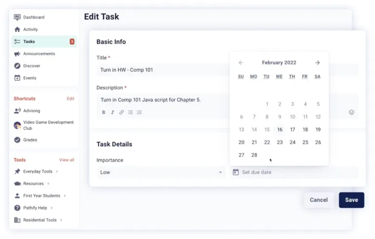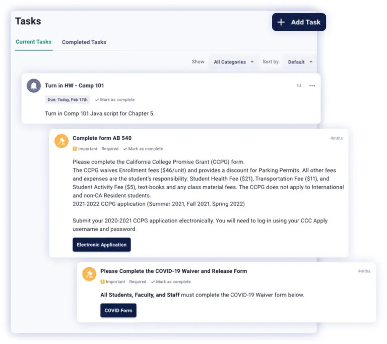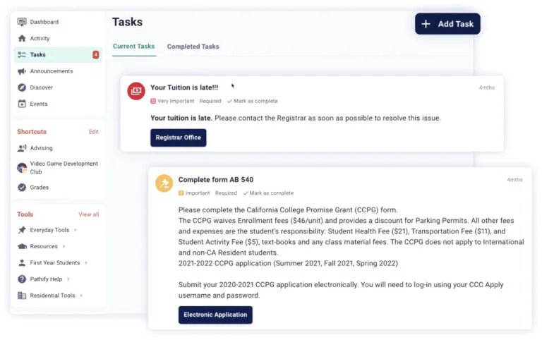 - Task Management: Display personalized to-dos like registration, advising, and financial aid steps.
