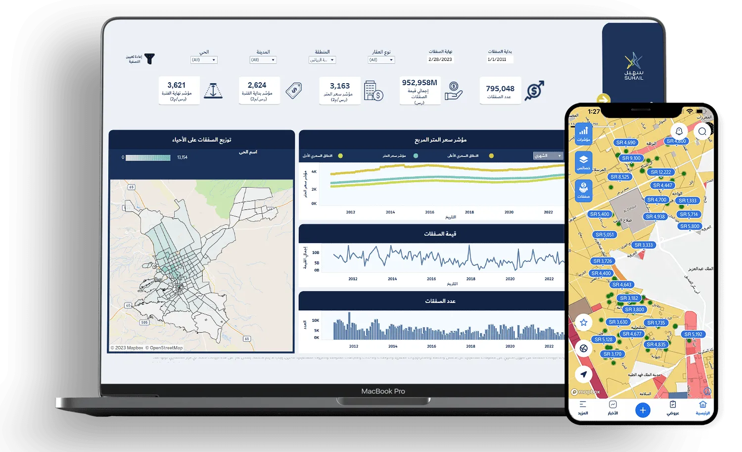 The platform includes specific solutions like Souq Suhail, a comprehensive platform connecting developers to potential clients and streamlining sales and marketing processes, from sharing properties and appraisals to booking and managing transactions. Misbar is an analytical tool that provides users with an extensive understanding of market trends and activity, transforming data into actionable insights and market intelligence.