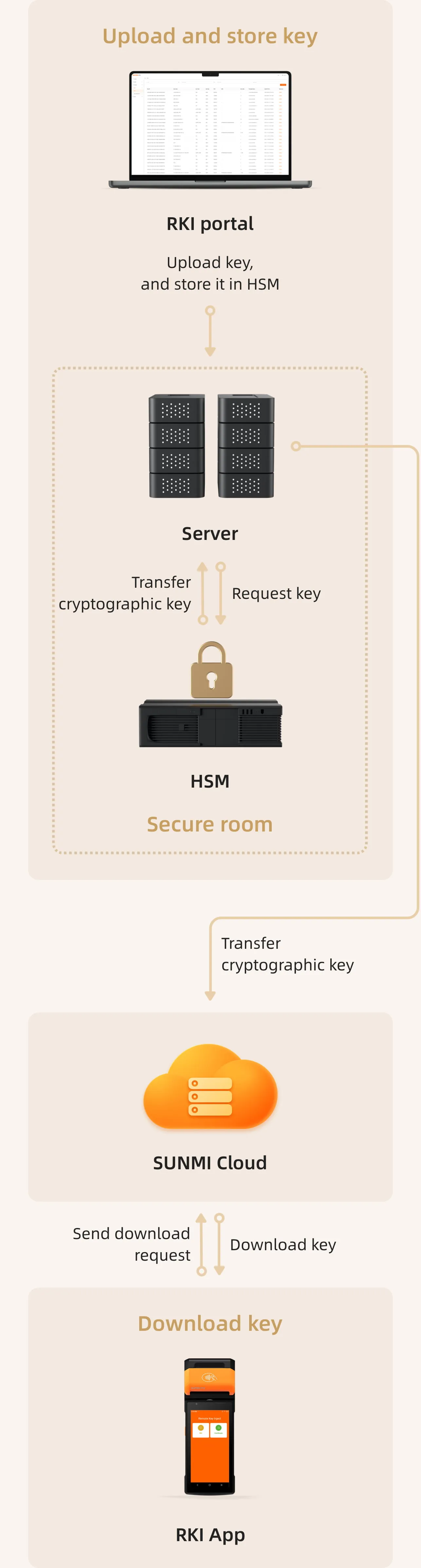 SUNMI Remote Key Injection (RKI) is a cloud-terminal integrated system designed to securely and efficiently inject cryptographic keys into payment terminals. It replaces traditional local key injection methods with a scalable, cost-effective, and PCI-certified solution that supports first-time injection, updates, and re-injection, ensuring secure payment operations across distributed environments.