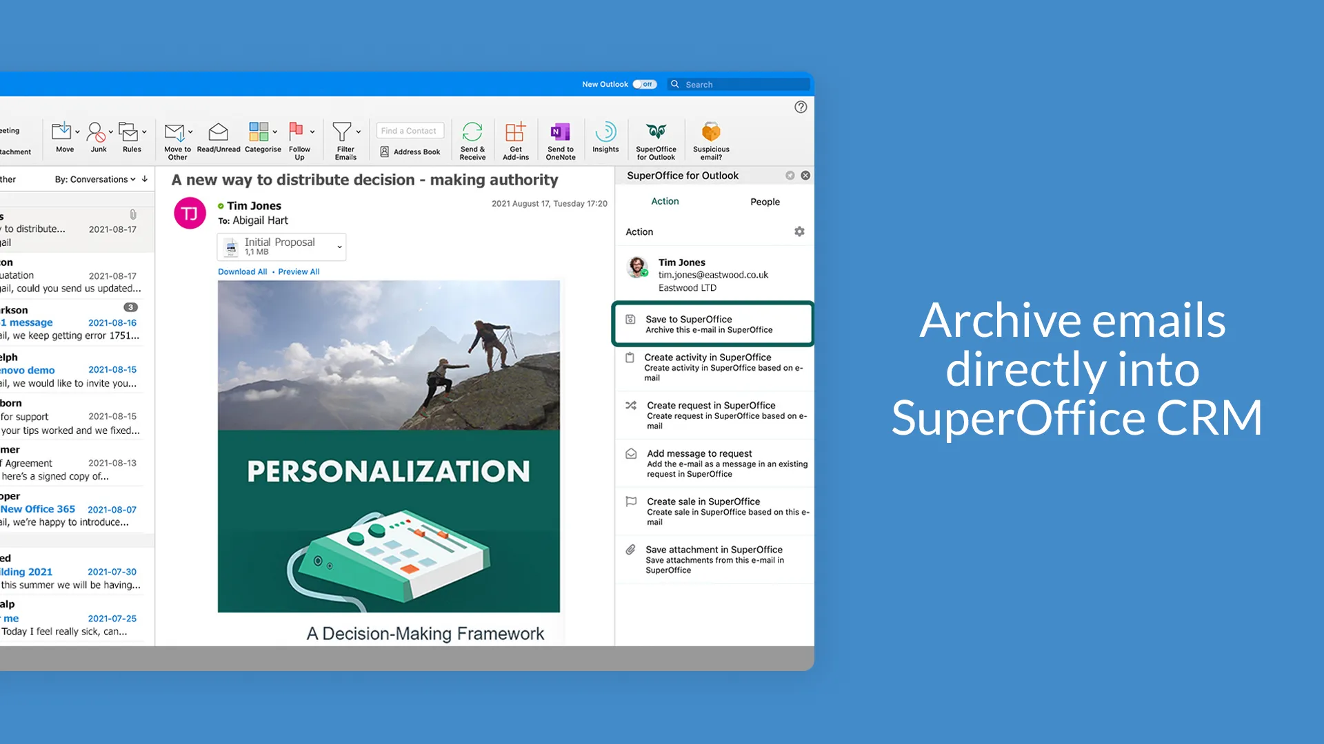 - Save emails and attachments straight into SuperOffice CRM.