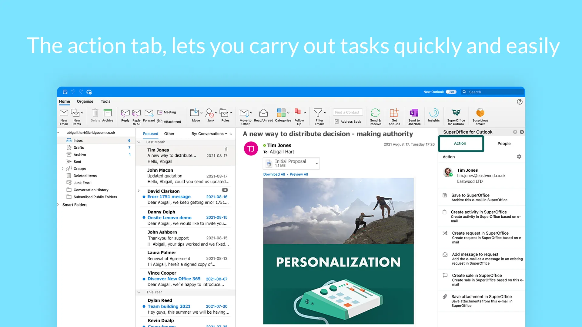 The add-in will help you save time and stay productive by letting you access key SuperOffice CRM information and features directly in your email, so you don’t have to switch between systems.