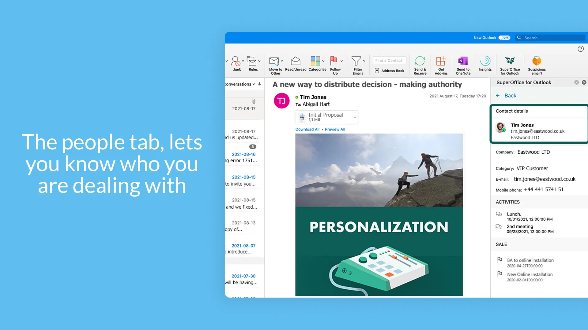 Work effortlessly between your Outlook 365 and SuperOffice CRM when you enable the SuperOffice for Outlook add-in.