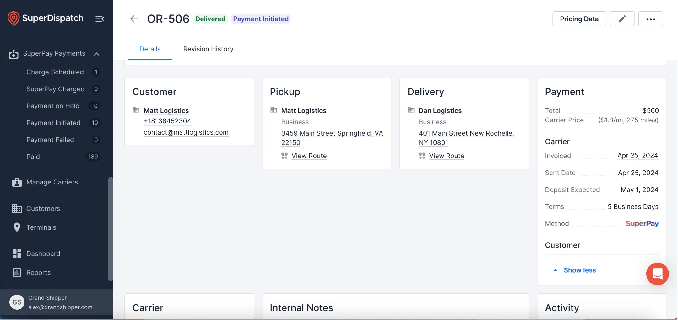 Streamline your payment process with these features so you can focus on moving more cars faster. Automated Payments Payments are processed on your terms automatically after Digital Delivery Verification, so you only manage exceptions. Manual Payments Full control and flexibility to process payments either on demand or scheduled for a future date. Reporting Instantly generate reports on payments made through SuperPay. Digital Delivery Verification Deliveries are verified automatically with GPS tracking, vehicle photos, and proof of signature. Accounting System Integration Connect your existing accounting software or ERP via Zapier or the Super Dispatch API. Flexible Payment Terms SuperPay your carriers ranging from 3 to 20 business days after delivery.