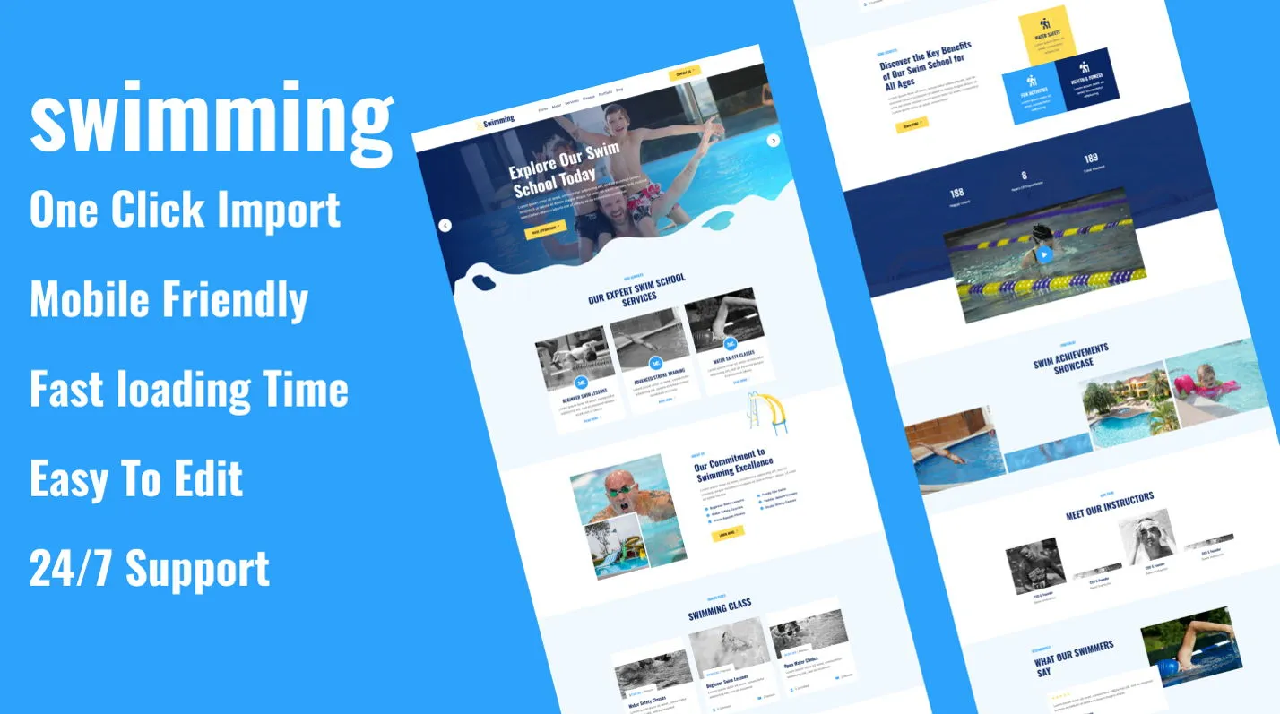 It contains everything that is required for a swimming school, training center, course hub, even for a playroom, kids campsite or kindergarten, This is the ideal solution for the website of Swimming.