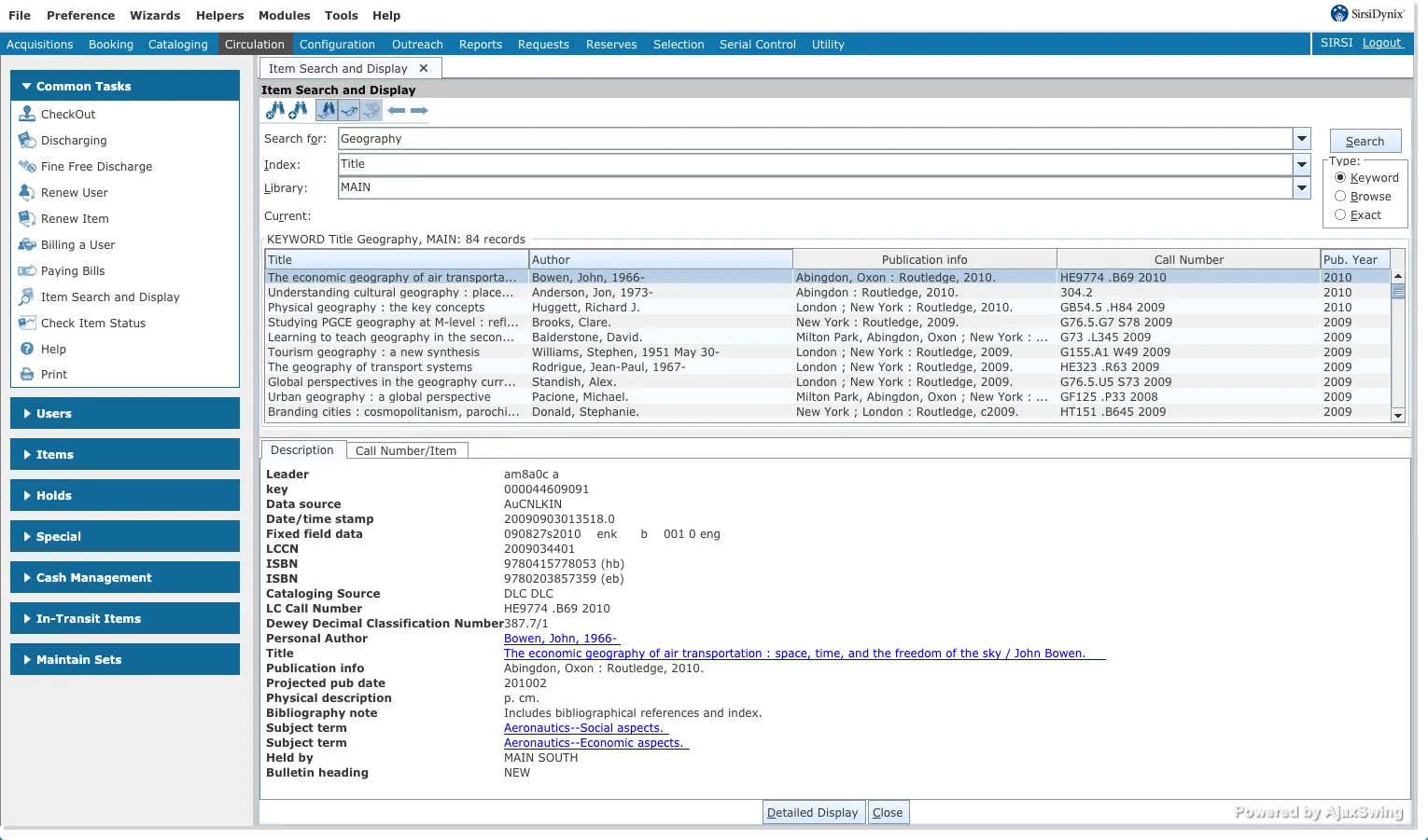 - Cataloging, circulation, acquisitions, serials, and reporting