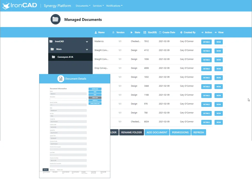 - Controlled Check-In/Check-Out: Securely manage file access and editing rights from within IronCAD or a web browser.