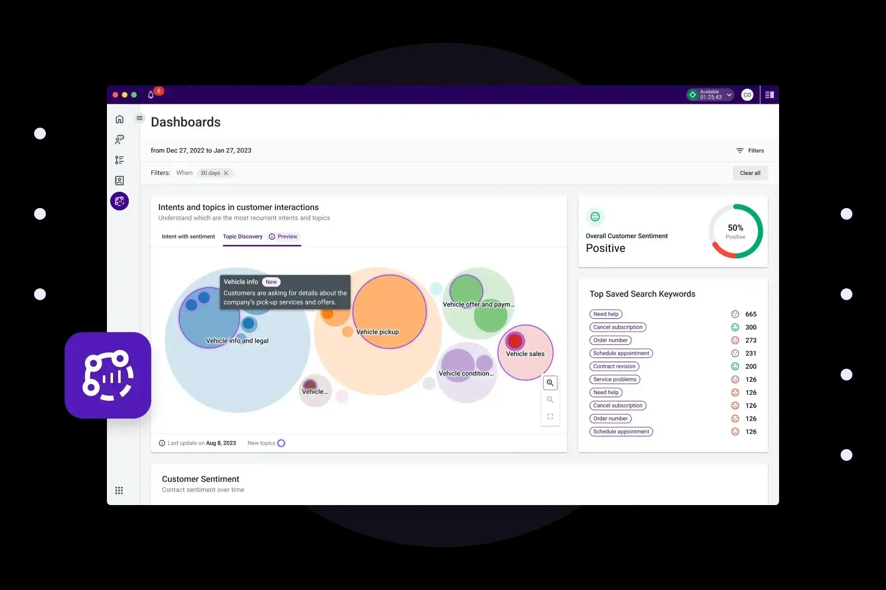 - Interaction Analytics and Sentiment: Surface key moments in conversations, identify sentiment trends, and discern customer intent to enable proactive responses.