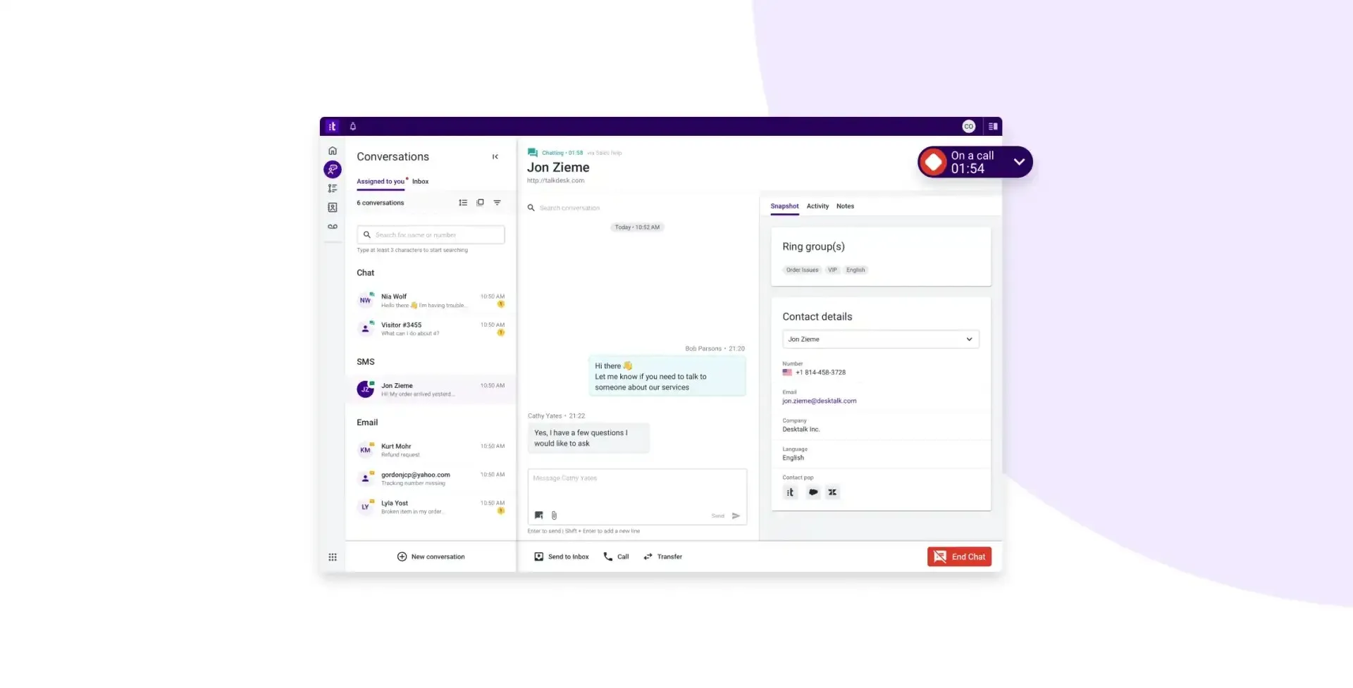 - Transfer Conversations: Quick one-click transfers to specialized departments to expedite resolution times.