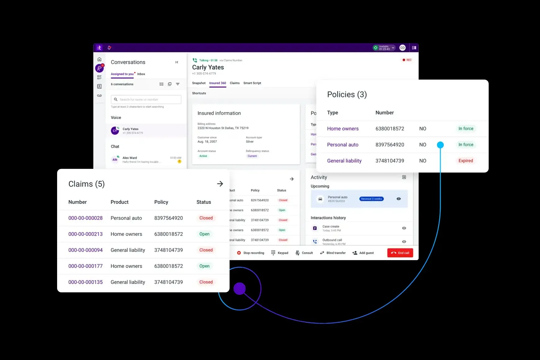 - Out-of-the-Box Integrations: Connects vital client data, including policy details and claims history, with core insurance systems.