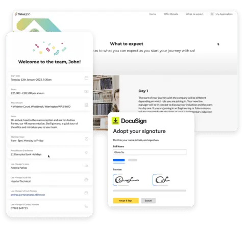 - Streamlined Employee Onboarding: Enhances new starter engagement with onboarding microsites, facilitates legally binding contracts via E-Sign, and integrates reference, Right to Work, and DBS checks.