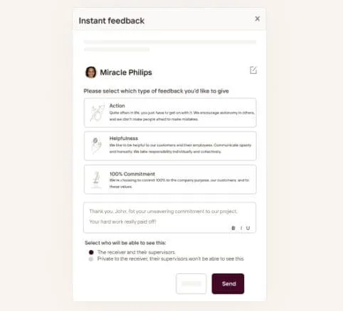- Performance Recognition: Easily recognize and reward top performers, flag goal achievement, and encourage peer praise within the platform.
