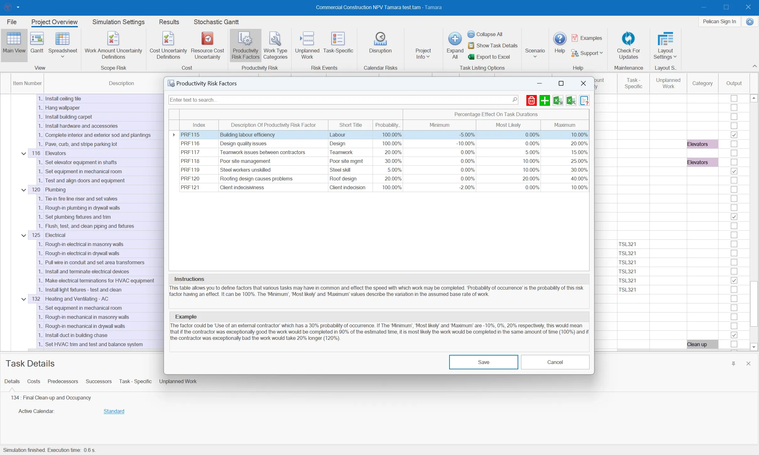 Tamara is a standalone desktop MS Windows-based application that allows users to include uncertainty in their project risk analysis models. To begin, the user imports a Primavera or Microsoft Project model into Tamara. During import, Tamara performs a health check on the model, providing a set of scores on the schedule's quality and highlighting any specific issues. Uncertainty about the time and cost of completing each task is then added by considering uncertainty in the task scope and the rate of progress in achieving the work. Risk events can also be added that would delay a task, the whole project, part of a project, require extra work to be done, etc. Tamara stores all this information with a copy of the original project schedule in a special file format. No changes are made to the original Primavera or Microsoft Project file, but when the project plan is updated, Tamara can update its own file with a single mouse click and adapt the risk and uncertainty information accordingly. Clicking the results tab then displays a range of risk analysis graphs and statistics for cost and time. Tamara simulates so fast there is no need for a 'Run simulation' button. The user can then view probability distributions in histogram or cumulative form for the cost, duration, start or finish date of any project component. Tornado charts also show which factors are driving the uncertainty in those measures.