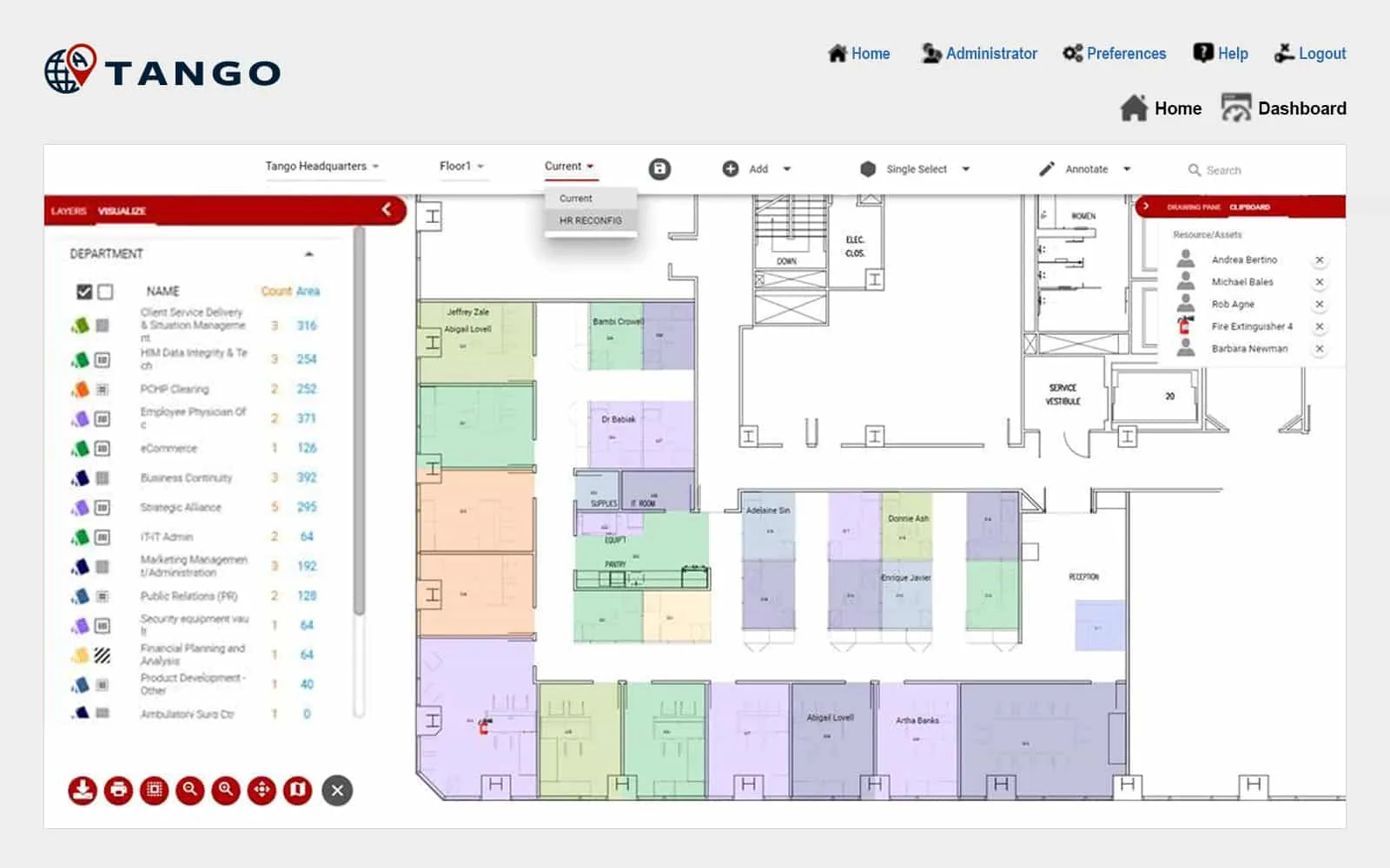 - CAD Integration: Bi-directional interface for all CAD files, displaying information and color-coding floor plans based on HR space and department data.