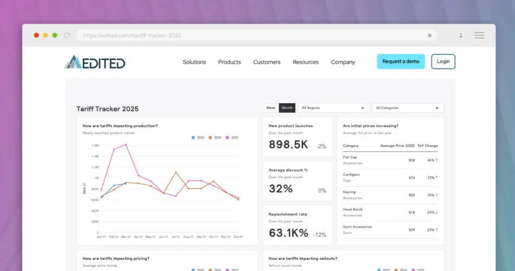 EDITED's Tariff Tracker is a powerful, innovative solution designed to give retailers comprehensive, real-time visibility into the effects of global tariffs on their business operations. The platform allows retailers to understand how tariffs influence pricing, product assortment, and promotional strategies across multiple markets. By leveraging extensive market intelligence and historical data, businesses can quickly identify trends, anticipate changes, and adapt their strategies proactively. The Tariff Tracker helps protect margins, optimize product offerings, and maintain a competitive edge in a constantly changing international trade environment.