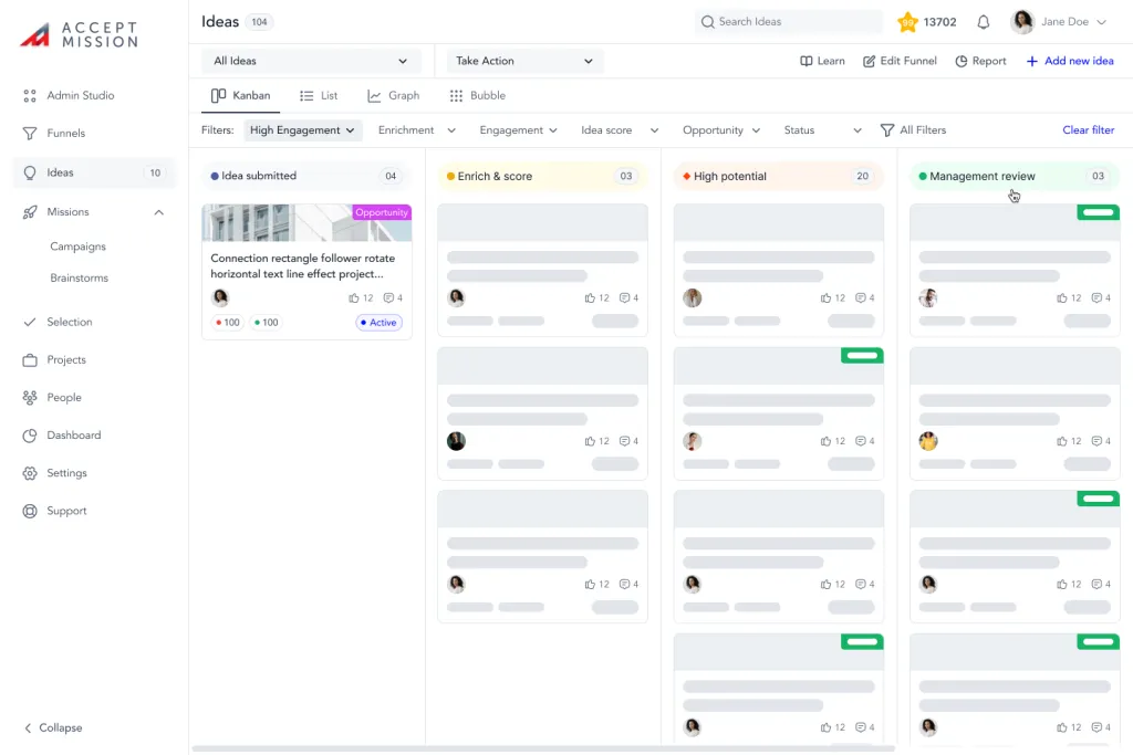 Accept Mission’s Task Management tool helps innovation teams organize, prioritize, and execute tasks efficiently. Integrated within the innovation lifecycle, it ensures alignment, accountability, and progress tracking across projects, enabling faster delivery of high-impact ideas and improved team productivity.